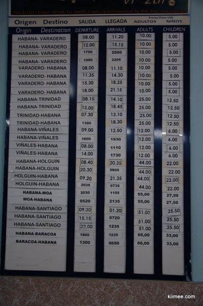 长途汽车站藏在一个不起眼的拐角,三道白色的门廊后,才看到一些买票和等车的人。不过我们看了半天招牌,也没有发现去哈瓦那的车。后来经人提醒,原来我们误入了当地人买车票的地方,老外买车票的柜台在转角的楼梯上去。看了招牌,票价不便宜,这已经是国营官方价了,最便宜就是这样。不过我们还有时间,照了几张照片出来,准备再看看是否有回头车可以更便宜。