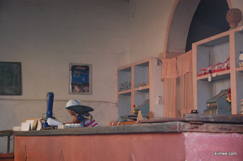 回到民宿,正巧碰到老马要去粮店买鸡肉,申请同行。对老马来说,带个外国人去粮店是一件蛮兴奋的事,还特意让我给他拍张排队的照片。结账时粮店的伙计会在粮本上做些登记,但是仍要交钱,土比(CUP)即可。老马后来又带我去了一家较大的超市,明显比我之前看到的门面要大,商品也很多很全。