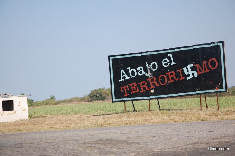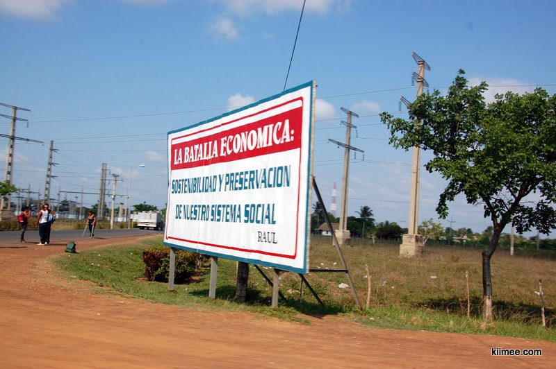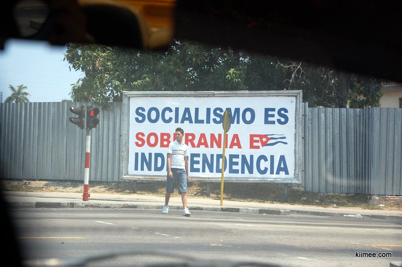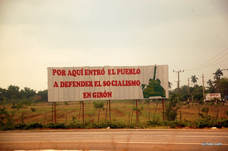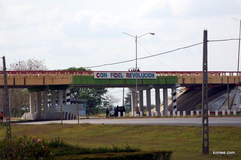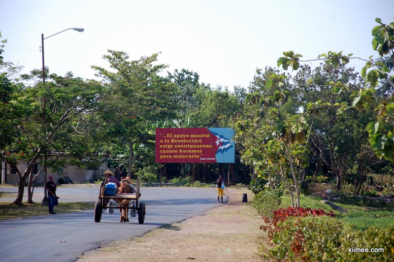古巴城市间的国道车辆非常少,虽然路面不怎么平整,但我们的小车轻松飙到100多。一路上看到不少标语,看图大概说的老卡说的好,小卡说的妙,社会主义呱呱叫之类的。