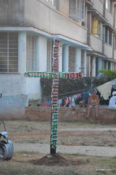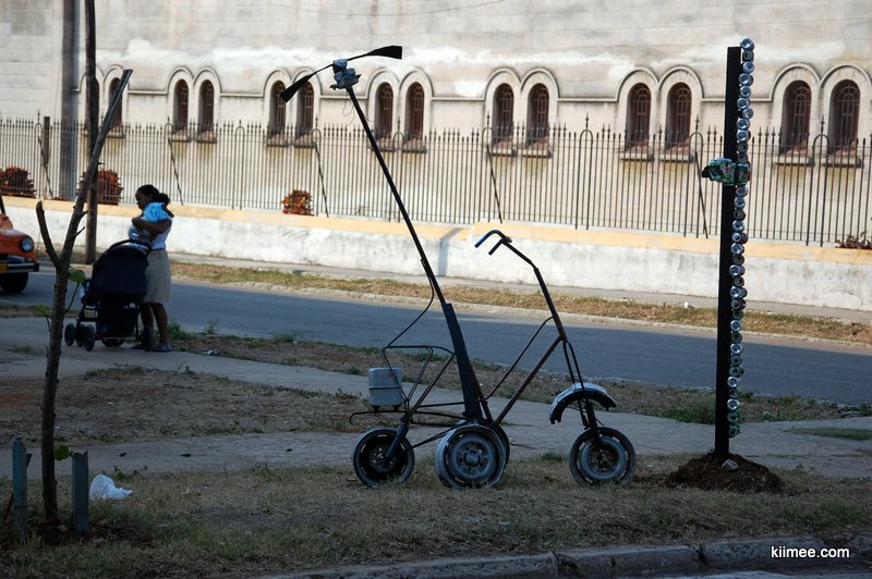 在附近有不少现代雕塑,是些废旧工业产品的组合拼接,如果摆在欧美的美术馆里可能不大稀奇,但这是在哈瓦那街头,这些艺术品显得格外另类。街道旁的一些树干上也有些涂鸦,奇怪的人脸或是古巴国旗。所有这些都集中在那天演出场地附近,我们猜测正是那些乐手的作品。