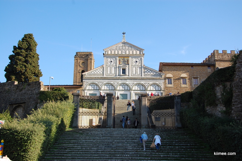 经过旧桥,到达阿诺河西侧,我们临时决定前往TripAdvisor上评价很高的米开朗基罗广场。阿诺河西侧以丘陵地形为主,我们沿着一条条小路不断攀爬,一座教堂建筑出现在眼前。登上教堂(圣米尼亚托大殿,Basilica di San Miniato al Monte)前方的台阶,不经意间回头,佛罗伦萨全城跃然眼前。