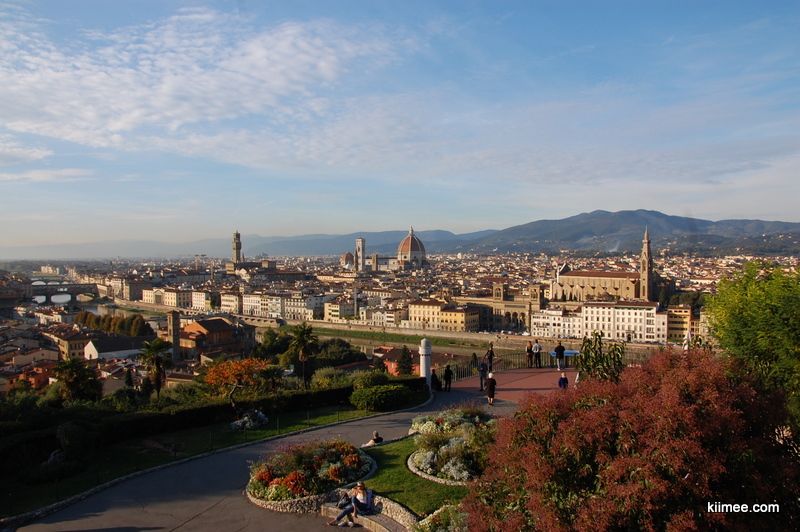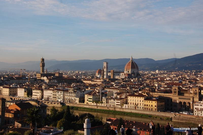 前方是金黄与砖红两色拼接的地平线,教堂的穹顶,一些钟楼,和布局杂乱但风格相似的古老建筑。这是米开朗基罗广场,青铜的大卫与人们眺望着同一个方向。一个晴朗的傍晚,如果你在佛罗伦萨,一定要来到这里,与人们一同坐下,一起望着不远方的佛罗伦萨,蒙着浅浅的一层夕阳,翡冷翠这个有些冰凉的名字也变得温暖。