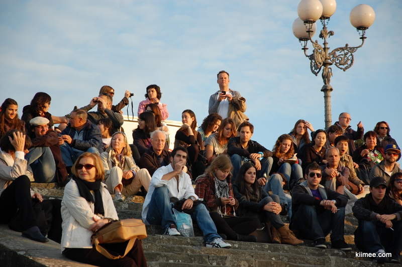人们沿着台阶坐下,像是在等待一部电影开场。
