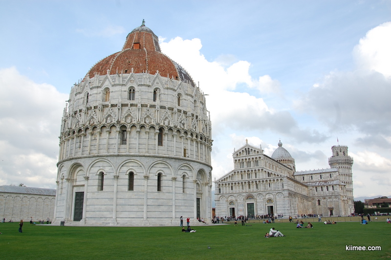 比萨我们就是冲着塔去的,一进门却被眼前景色怔住。大教堂、洗礼堂加上塔,矗立在一大片绿草地中间,黄昏的阳光温柔地照在白色大理石上,像是童话世界一样漂亮。斜塔确实挺斜的,包括旁边的教堂也有点斜,不过照片上却看不太出来。