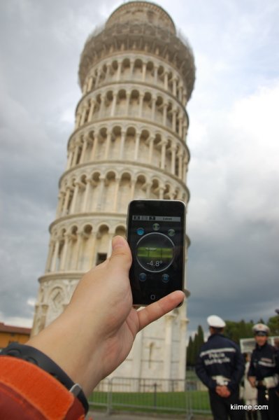 总觉得斜塔不是特别斜,而且周围包括教堂、坡啥的都挺斜。本着科学钻研的精神,我们对斜塔进行了简单的测试。首先是用itouch带的水平仪进行了测算,如下图: