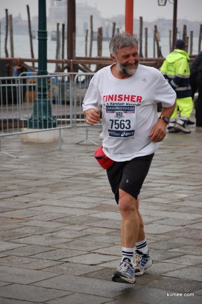 由于马拉松比赛的终点设置于圣马可广场附近,所以仍有一些选手跑过。比赛为早9:30开始,到我们经过时大约已进行5个多小时。可以看到这时经过的大多为非专业选手,疲态尽显,但围观的游客掌声与鼓励的呐喊不断,语言也有很多种。天气阴冷,秋雨将整个广场披上一层灰暗寒意,临时划置的跑道是难得的一抹亮色。