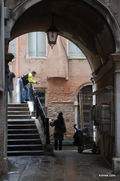 今天威尼斯风很大,雨基本没有停。虽然天气不好,但确实也让我们很彻底地领略了一回水城风情。整个城市很多路面都漫上了近20-30公分的水,路面上都架上了半米高的简易板桥,看来这是雨季常有的事,威尼斯人早有准备。