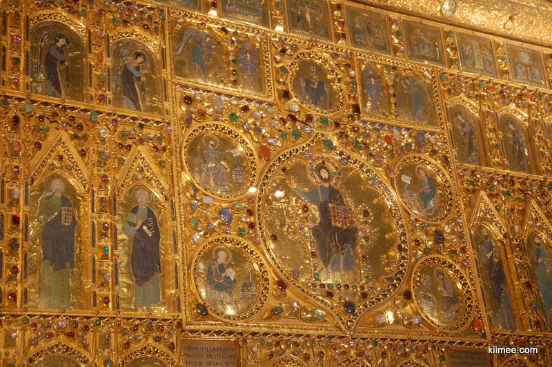 大教堂里面可以登顶,大约是4欧,有珍宝馆可以看,大约也是4欧。除此,珍宝馆应该有不少可以看的东西,因为从1075年起,所有返回威尼斯的商船都需要交一件珍贵的礼物。此外主祭坛也是需要在里面买票的,2欧一个。主祭坛是圣马可教堂的重要景点,里面有一个金屏pala d’oro,嵌满了4000多个宝石,建于公元976年,:)