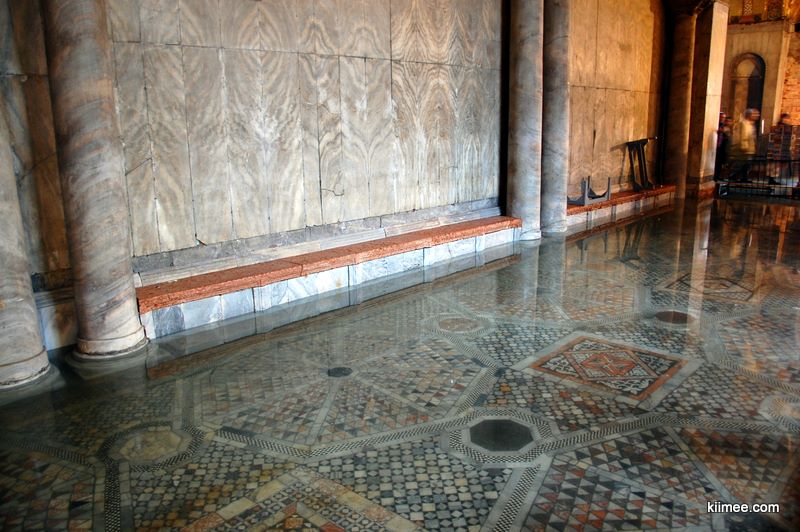 路上很多人穿上了雨靴,真是有先见之明。我们站在板桥上排队进入了著名的圣马可大教堂。大教堂里面都已经浸上了水,都快到大殿了。大教堂不用门票,但是一定要存包。一般女士的挎包可以带进去,但是背包、电脑包那么大小就不行了。在附近的小街存包免费,有告示告知。