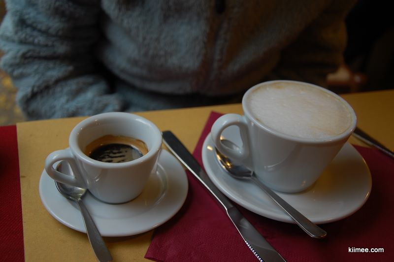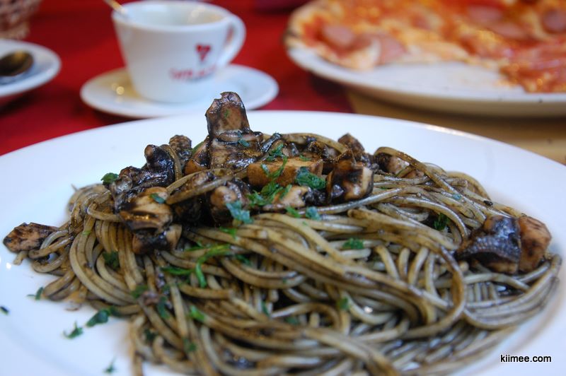 今天还有个重要事情就是吃墨鱼面。墨鱼面一如传说中的,好黑巴黑。墨鱼肉很肥厚,面比较硬,价格我们看有9欧-11欧不等的,店不同价格不同。饭后说奢侈一把吧,我们又要了咖啡。kingwing要了意式浓缩咖啡,meer则直接要了个卡普奇诺喝个爽。