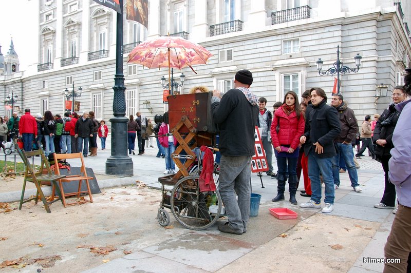 马德里王宫非常漂亮,广场上有很多游人,有人摆了老式相机在给游人拍照。大抵上是让游客端坐好,然后拿出老式的帽子和围巾搭配一下,最后用老式木头箱子照相。先给照出负片,即黑白颠倒的样子,然后再拿相机对着负片拍照。照片在显像液里面泡一会,样子就显示出来了。我们被这种照相方式吸引住,忍不住也上来拍一个。两个老外在熙熙融融的街头拍这个玩,自然引起了一群人围观。这时候有个高个大肚子的老头对我们说,哪里人。我们回答说中国人,他立马就说“啊,你们好!”,然后开始用英语和我们说话。好不容易在西班牙碰到一个讲我们能听懂语言的人,反正照片也要等一会才能处理好,我们自然也很高兴地聊开了。