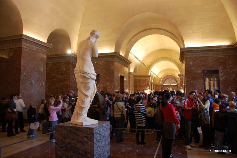 因为天气太差,刮风下雨,所以今天的整个行程都安排在了卢浮宫。卢浮宫真的藏品很多,场地也非常大,我们快快逛也只逛了下面几层,最上的油画层只能以后再来慢慢欣赏了。埃及馆和中亚馆内容都比梵蒂冈要多多了,如果要租用讲解需要压护照的,讲解目前还没有中文的。在卢浮宫,我们就真正见识到法国人的牛脾气了,这么有名的馆,居然每个藏品边只有法文介绍,英文介绍非常少见。不过还好有重点藏品的翻译牌上有英文、日文、韩文等,非常感谢我们曾经学过英文。 维纳斯的雕像一如既往的挤满了人群,蒙娜丽莎的油画前也是人头攒动。在喧闹不堪,熙熙融融的人群中,隔2米多远看那么小的蒙娜丽莎,不是一件很爽的事情,如果可以的话最好带个望远镜好好欣赏。 维纳斯雕像 维纳斯雕像