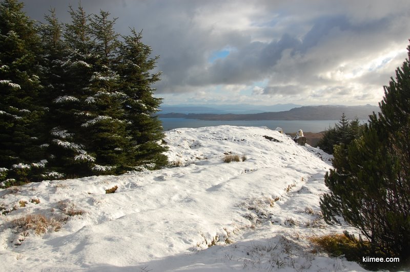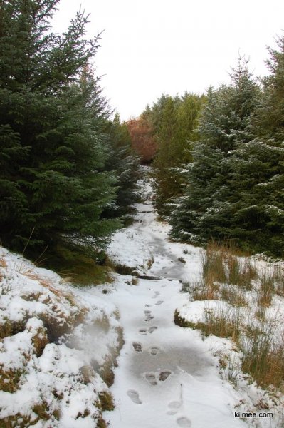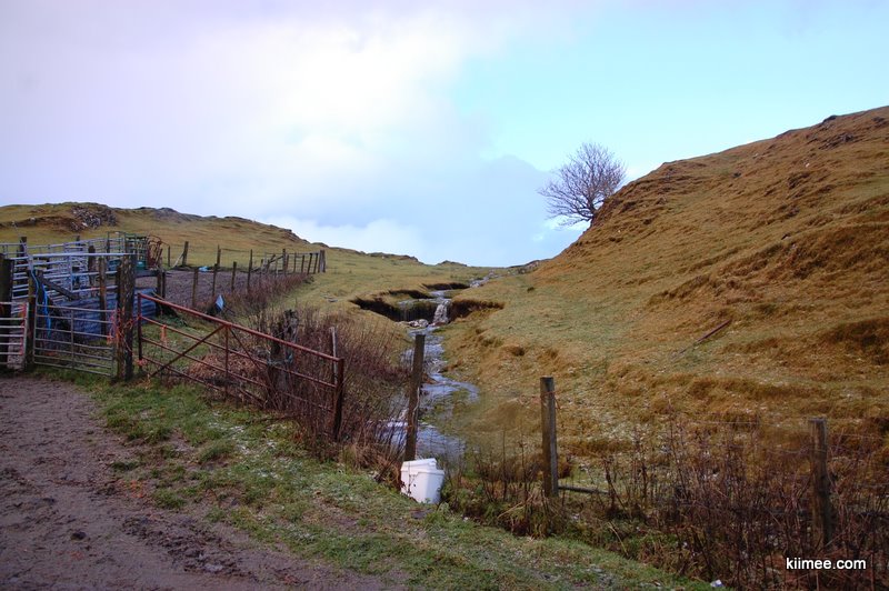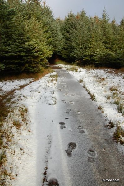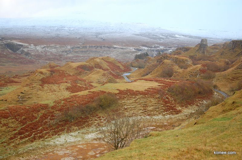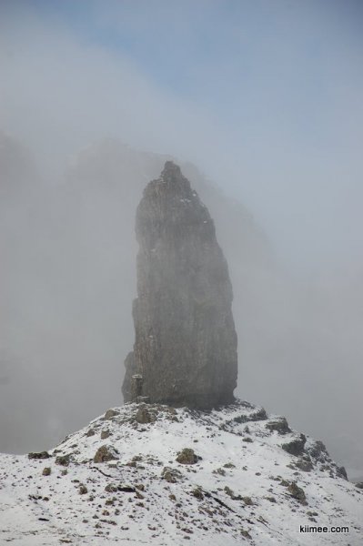 穿过一个树洞后,冰雪的痕迹越来越多。之后不久,我们遇到了今天行程的第一位旅人,大约40多岁,一位和蔼的本地妇人,我们相遇时她正在返程。攀谈片刻,虽是陌生人,却像故友重逢般相谈甚欢。继续前行,几分钟后又遇到一位与我们年纪相仿的小伙子,从伦敦开车到这里,为了今天拍摄日出,前晚就睡在山脚下车里,早上天蒙蒙亮的时候迅速吃饱喝足,摸黑前行,小伙子边讲边演,眉飞色舞,不过他说住在车里实在太冷了,今晚计划回到Portree找一家客栈好好睡一觉。