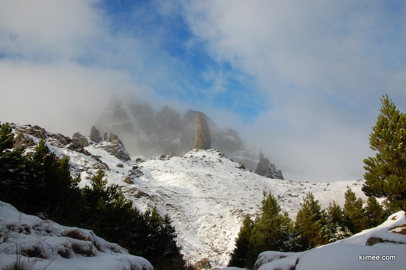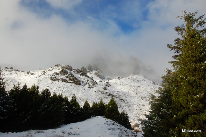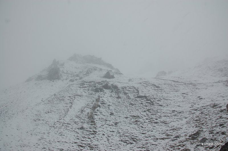 好不容易,爬了1个小时,进入一片山谷,却还不见老人峰的身影。正在我们准备继续前行的时候,突然开始下雪,并且迅速在一分钟内转成狂风暴雪,打在脸上生生的疼。