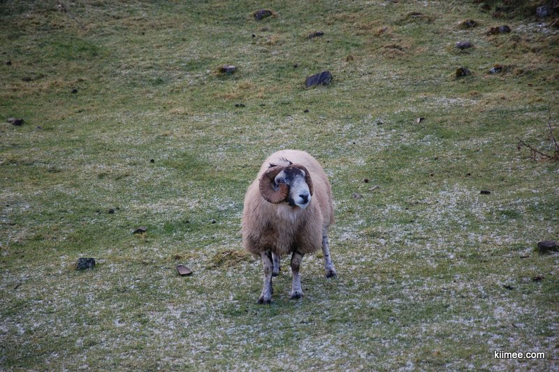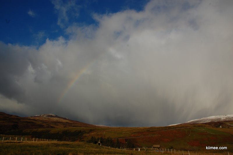 从老人峰下来,虽然鞋子已被微融的积雪渗湿,但我们兴致高涨,紧接着坐公车前往下一站——仙女峡谷(Fariy Glen,有的地图名字不同,但含义相仿)。仙女峡谷的入口在路边一个hotel(Uig Hotel,可向巴士司机说明)的背后,沿着一个小土坡爬上去,就进山了。白白的云彩就在坡顶上,映衬着蓝天,漂亮极了。一步一步,就像要走到画里面去一样。登上小山坡,前面是比较平缓的土渣路,一直蜿蜒进到山脉最深处。沿着这样的路一直往里走,两旁的牧场全是放养的胖绵羊,白脸黑脸的都有。一条巨大的彩虹挂在左侧的山间,如仙境一般。正当我们惬意地逗逗绵羊,拍拍照片时,天空突然掉下来几个小雪粒。好像要下雪子了,幸好我们准备了有伞。不过几分钟后,我们郁闷的发现,这不是普通的雪子,而是小冰雹,来势还不小,大小在米粒与绿豆之间。不仅是冰雹,还夹着雨,卷着大风。伞几乎要被吹坏,勉强遮住头。也没有其他的办法,我们勉强躲着雨,全副武装继续闷头向前走。大约走了10分钟,冰雹渐小,天空又晴朗起来。让我们再次感叹高地的气候多变。