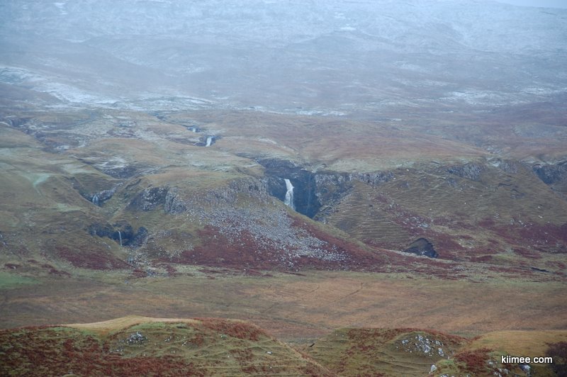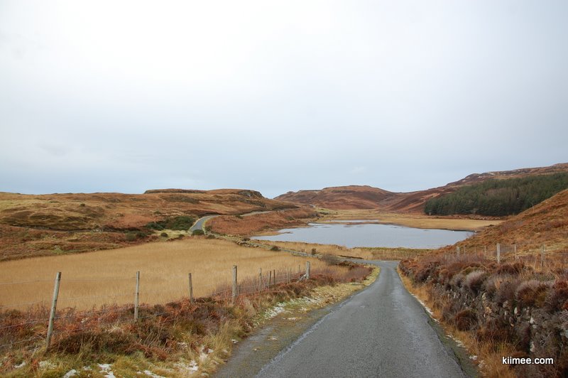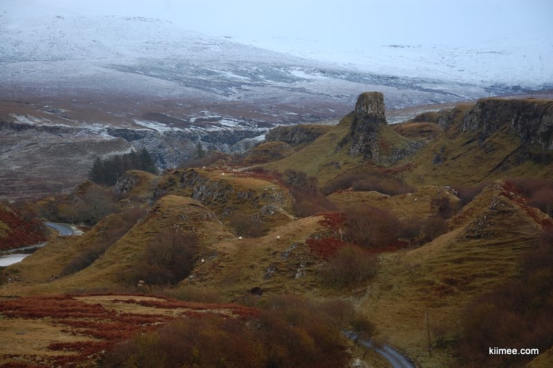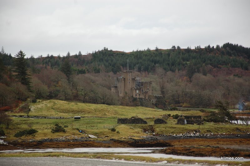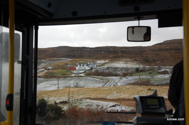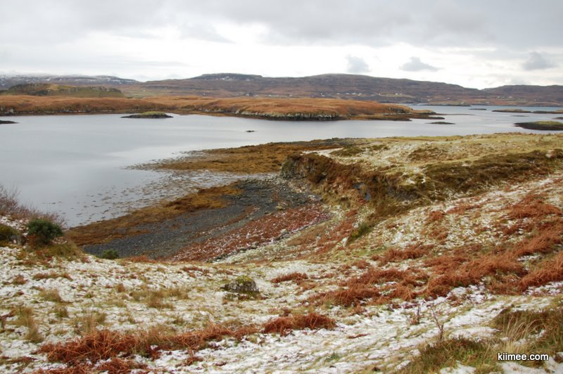 我们驻地这里从昨天晚上开始,一直下雪,地上都有一层薄冰。看着雾蒙蒙的天气,我们彼此安慰,说如果到了那边天气太差,就不下车,今天就坐bus环游全岛算了。大约40分钟车程,到达城堡,天气貌似还可以,没有下雨,阴阴的。于是我们下了车,计划在远处拍些城堡的照片,搭乘15分钟后的同一班巴士返程。但是四处寻找都找不到可以拍摄到城堡的角度,但是发现路况尚可,徒步线路只在起始处有一小段冰雪路面。于是等巴士到达后,我们向司机说明情况,巴士司机嘱咐我们be careful,空车返程Portree。