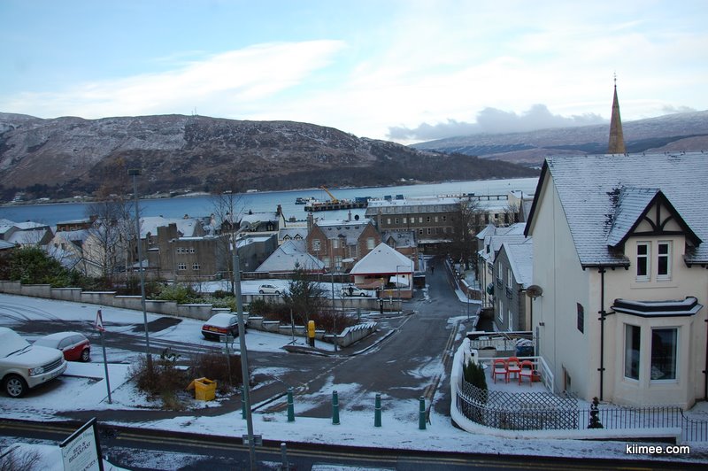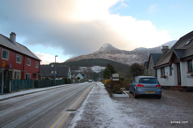 这里的天气与Skye岛上多变的雨雪天气截然不同,午后的阳光懒懒地照在黑色石块铺成的路面上,微微泛着点光,远处是Loch Eil湖,住宅依山而建,干净整洁,空气中弥漫着清新的味道。总而言之,让我们感觉既懒散又舒适,这一刻,我们俩共同做了个决定,今天不中转了,就在Fort William住下了!于是立马找寻住宿,问了几家B&B,找到个四十磅含早餐的,房间、位置、风景都很满意,这个价钱在淡季比较合适了。