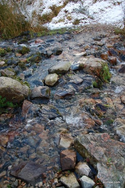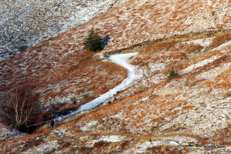 看着雪地上只有自己留下的脚印,我们应该是今天的第一批爬山者。一路上行,薄薄的积雪倒也好走,但五分钟后我们傻眼了。一条蜿蜒的小路已经成了小溪,大概是因为白天山上积雪融化,顺路就直接流下来了。小溪的大部分是冻成冰的,估计入冬以来,冻了又解,解了又冻。总之,简单来说,我们需要在有点化的结冰的小溪上走。试了一下,真是很滑,特别是meer同志的平地板鞋,只能小步小步地滑着走。路旁的厚厚的草都已经冻上了,下面有淤泥,踩上去软软的,有时会陷下去很多,所以也没法走。慢慢地亦步亦趋的走了几分钟,我们两人开始纠结,到底要不要返回容易的线路来走。因为这才刚开始,后面如果都是这种路就基本没法走。考虑了2分钟,我们决定返程,前往easy路线。