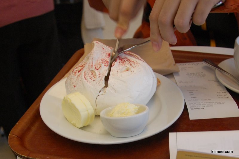 今天首要需要介绍的就是一个名词meringue(蛋白霜饼),附图如下。请大家记住,这个大白胖桃子不好吃!!!今天kingwing同志在V&A博物馆的食堂以身尝试,绝对是蛋白加砂糖的硬硬混合物,腻人得不行,轻易不要尝试,而且绝对不能在V&A博物馆的食堂尝试。