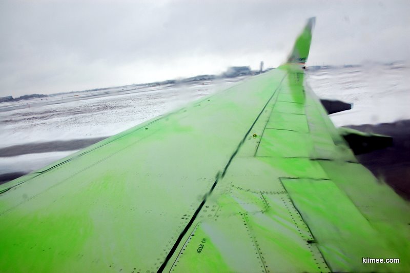 登机后雪愈发的大,机翼已经已经积了薄薄一层。我们的飞机在跑道上转来转去,迟迟没有起飞,后来发现原来是在排队等待清理积雪。飞机在跑道上大约溜达了15分钟,终于与四辆工程车相汇,每两台负责一侧机翼,先喷洒橘色液体,之后是绿色液体,有些像是果冻的质感。地勤把机械手臂操纵得相当灵活,就和电影里演的清扫机器人一样,大开眼界。