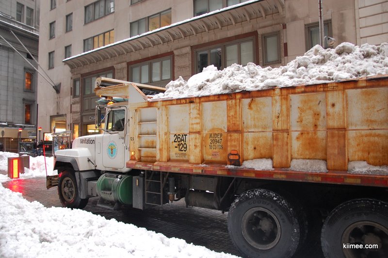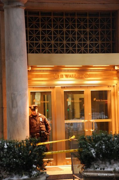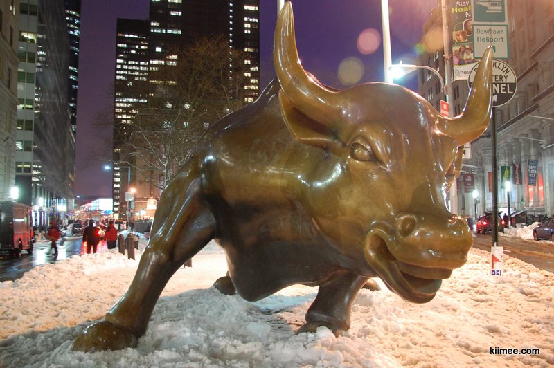旁边的纽交所不让靠近,只能远远拍个门口的照片。大概是下雪太多,堆在路边的雪已经积了很高,只能用卡车装着运走。华尔街的大铜牛非常有名,但却不在华尔街上。我们沿着华尔街走了一圈,又围着纽交所绕了一圈,怎么找也没有找到。难道被埋在雪堆里面了,想想也不无可能。最后碰巧问了一个中国人,被告知在百老汇街上,沿着百老汇街走了100米左右,终于找到了这头牛,ye!!
