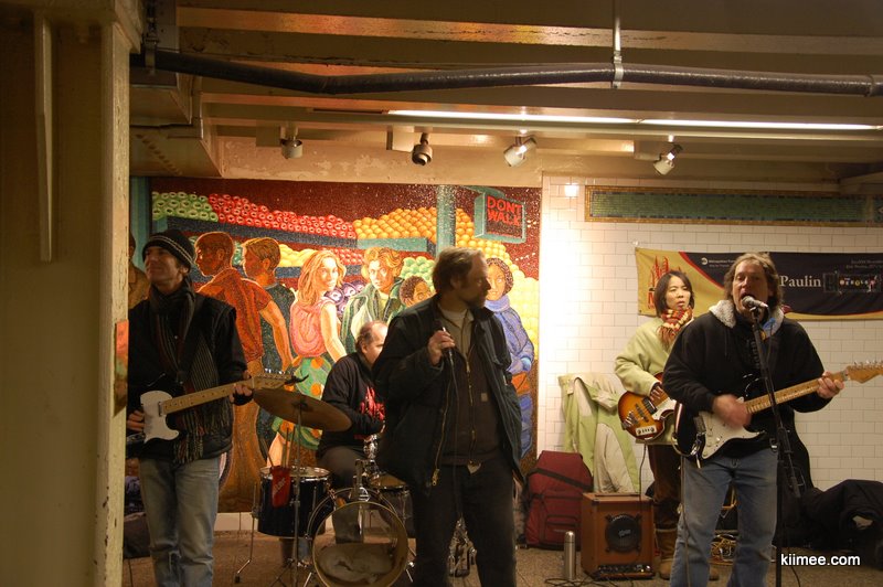 从MOMA出来,换乘到时报广场的地铁,碰到有一队乐队在演出。主唱衣衫褴褛,我们当时一度认为是有个路过的无所事事的家伙去客串;但是那把箱琴看上去非常体面,很讲究的围巾,斯斯文文的眼镜,如果不是戴着一顶很应景的棒球帽,猜测他刚从华尔街下班也不为过;贝斯是一位女性,看上去有些像是日裔,因为每首歌演奏完都会很习惯的深深鞠躬;主音和节奏两位倒是非常恰如其分,和平日看到的街头艺人差不多;在箱琴旁边有两个黑人小伙子,我们去听的第一首歌,他们是负责和声的,但是第二首歌似乎又退出了圈外,在一旁聆听。风格也比较特别,有的歌听上去很像60年代那种美国的乡谣,有些晦涩,有的又非常轻松,甚至旁边不少观众跟着一起哼唱。