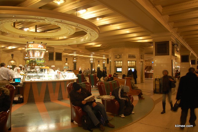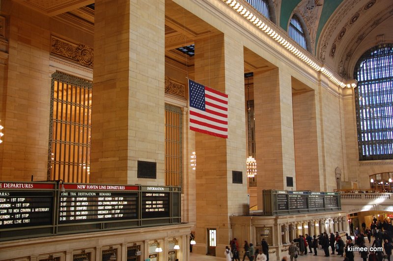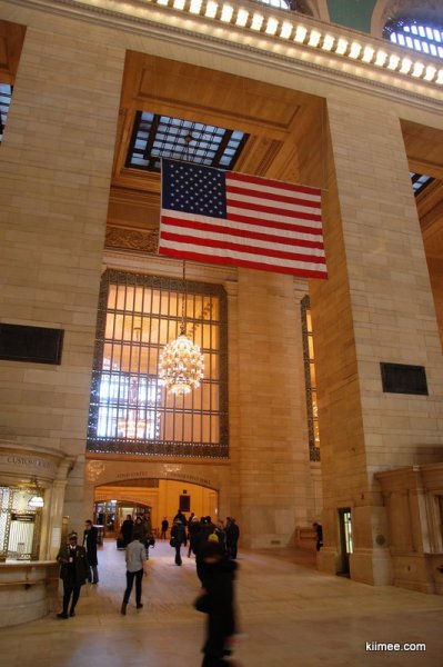 中央车站的大厅挂着一面巨大的美国国旗,再次发现美国人真的很喜欢挂国旗。天顶非常漂亮,是画的星空图,据说是根据中世纪时候的星空图描绘的,所描绘的星空是反的,后人解释说是因为根据上帝的视角俯瞰星空,所以是反的。