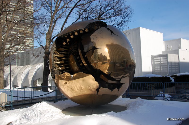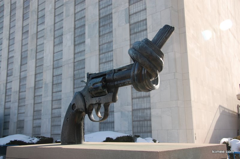入口处是两座著名的雕塑,打结的手枪是卢森堡在1988年赠给联合国的,象征意义非常明显。表面斑驳的雕塑名为破碎的地球,意为如果不注重保护地球,人类将失去家园,这个是意大利的赠品。