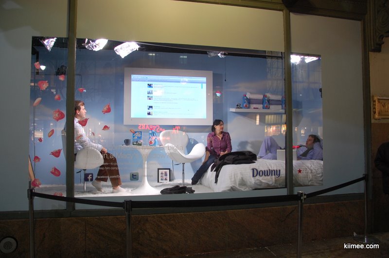 回家的路上,路过一个商场的橱窗,里面正在举办真人秀,引得不少人驻足观看。3个人(其中有一人在沙发上)正在热烈的讨论,中间大屏幕的facebook正在现场直播,路人可以直接参与,也有很多网友通过facebook参与讨论。