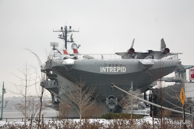 地铁前往50街站,步行前往无畏号航母。这艘航母在退役后几近辗转,最终于1982年停泊在曼哈顿西岸成为博物馆。不过由于甲板结冰,即使买票入内也无法登上甲板参观,而大多数飞机都陈列在那里,只得放弃。第一次见到航母,我们沿着码头几乎绕了半个船身才离开。