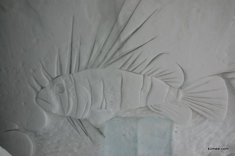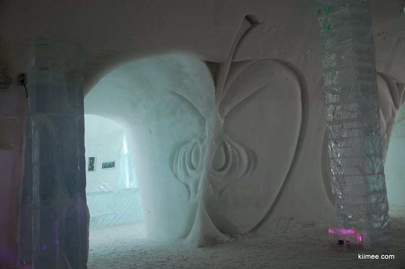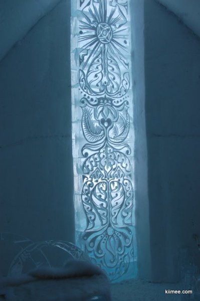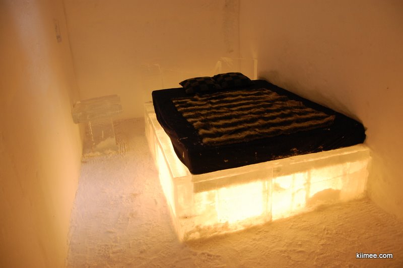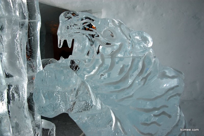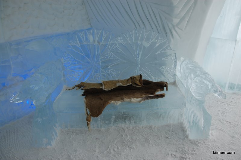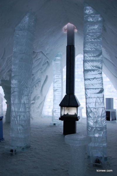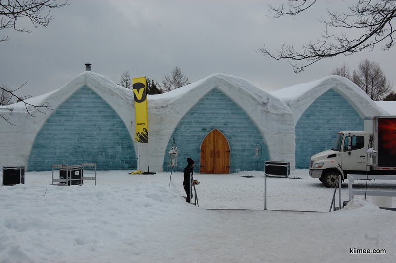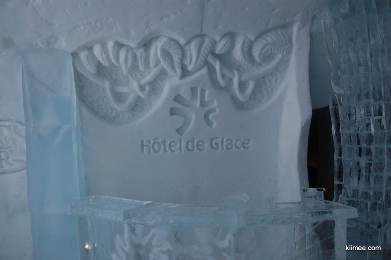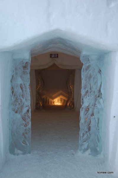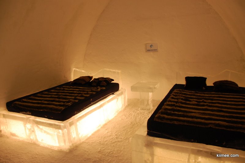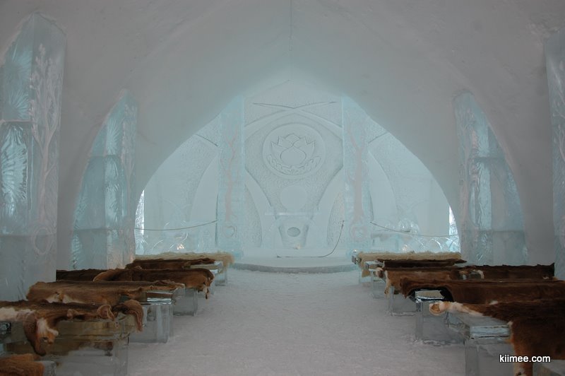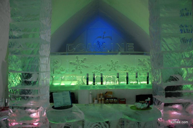 Ice Hotel,冰屋酒店,法语为Hôtel de Glace,位于魁北克城以北约15公里,每年冬季开放,今年的开放时间是1月7日至3月27日。酒店除住宿外,也向普通游客开放参观,并提供英法两种语言的导览。导览提到,瑞典在1990年建立了世界上第一个冰雪酒店,据说有几位魁北克人在参观之后就萌发了在故乡创建这个主题酒店的念头,并最终于2000年建成开放。目前共有36间客房,还有两间酒吧与一些其他公共设施,面积超过3000平方米。由于所有客房只在晚间使用,所以白天几乎所有区域都可进入。一些房间比较普通,而更多的房间具有不同的主题,冰雕、雪雕配合五彩光线,如梦如幻。导游说目前房间内温度大约-5到0摄氏度,屋内没有任何取暖措施,包括照明都经过特别处理,几乎不会发热,有个别房间设有暖炉,不过据导游讲这个只是起到心灵慰藉与暗示的作用,实际发出的热量微乎其微。开始游荡没什么感觉,后半程明显感觉会冷。于是,我们逛一会儿就需要到屋外暖和暖和,所以,“外边儿凉快去”在这里算是一种福利。