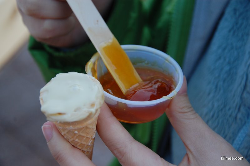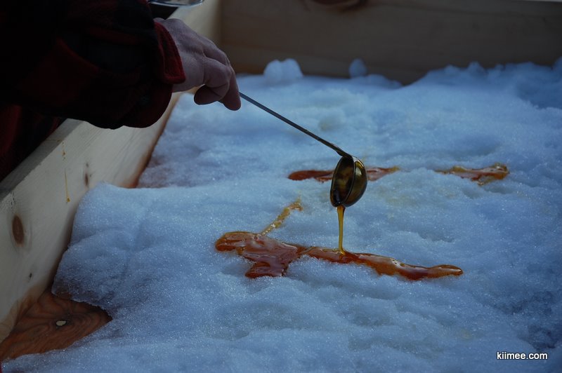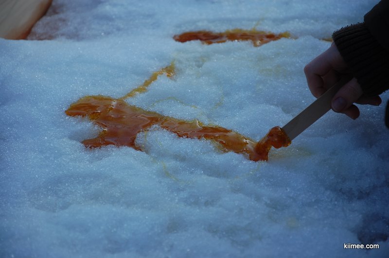 虽然面积不大,但是里面有些像个迷宫,再加上在户外晒太阳解冻的时间,我们在两个多小时才返程。回城后恰好看到有一个露天枫糖摊。枫糖是加拿大特产,是一种特别的枫树中提取的树液,据说从树上钻孔,枫树液便会徐徐留出,有些类似橡胶。卖主是一个老大爷,除了一个玻璃柜之外,还有一个木制的摆架,上面铺了厚厚的一层雪,用勺把枫糖浆舀出倒在雪上,再用木棍慢慢粘成一团就可以吃了。糖浆比较稀,不过遇雪变冷会相对凝固一些,而且蘸一些雪混合着吃口感甚至更好。