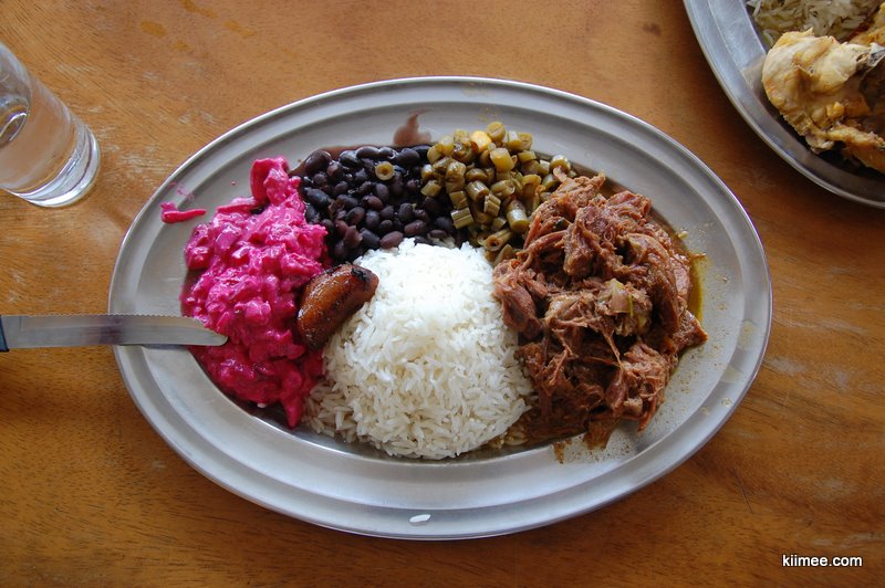 午餐终于吃到了哥斯达黎加著名的Casado(维基百科:http://en.wikipedia.org/wiki/Casado),米饭、沙拉、黑豆、煎香蕉(可能是比较特别的一个品种)、猪牛鸡鱼等任选一种。味道和中国菜比较相似,肉或炖或煎,很合口味。最重要的是,居然在桌上摆着泡菜,虽然泡的白洋葱而不是白萝卜,不过也让meer同志激动的大呼小叫,吃个爽饱。