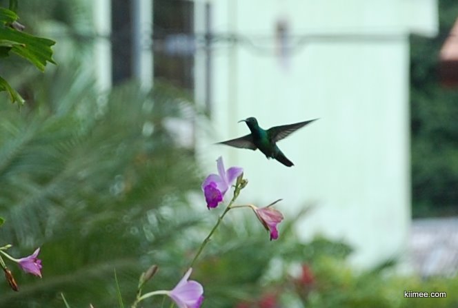 下午没有什么安排,吃完中饭我们就在镇子附近溜达。经过一个小花园,不经意就见到了传说中的蜂鸟。虽然这里的人们对这鸟就像见到蜜蜂一样习以为常,但对我们来说就太难得了。这家伙一天到晚好像都吃不完,翅膀总也停不下来。此外还有一些当地植物,当然对于我们来说就是奇花异草了。
