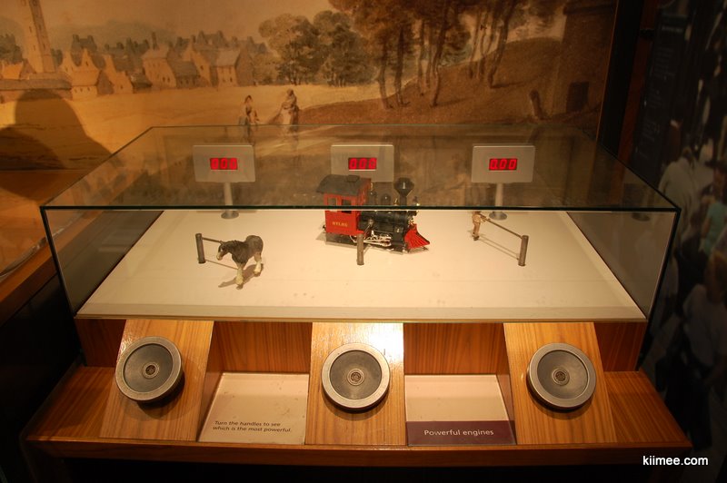 下方金属圆盘可以手动旋转,旋转时可以分别显示人力、牲畜、蒸汽机车的马力数,这一陈列是讲述工业革命带来的力量的飞跃