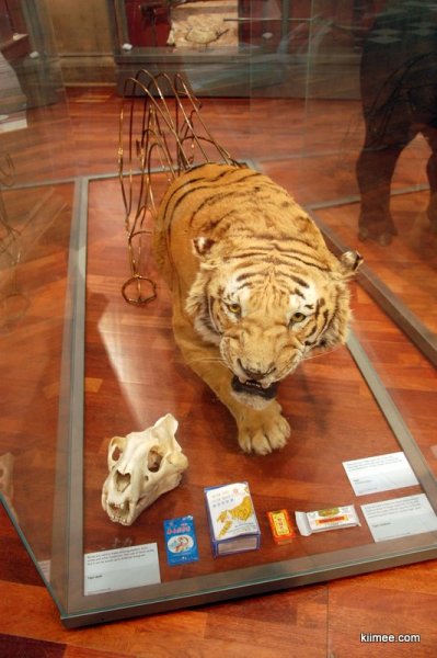 老虎标本,下方陈列了一些中药,如麝香虎骨膏等,说明中写道每公斤虎骨价值大约250英镑,大意为保护珍稀动物。不过这一点可以看出,英国人对中国的了解实在浅显,第一,膏药已经很不流行了;第二,麝香虎骨膏中含有多少虎骨这个命题在中国不重要,好比牛奶中含有多少乳制品成份不重要,含有三聚氰胺才是重头戏。