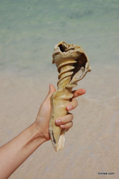 上午的水温还是有点凉,不过下水后很快就适应了。俗话说水至清则无鱼,这里的海水虽然一眼可以望穿,却是找不到啥鱼。不像埃及的沙姆和大哈巴,站在岸边都可以看到漂亮的鱼儿。海很浅,走出去20-30米远才勉强没腰。我们走走潜潜,勉强发现了一小群银色小鱼和2-3只黄色尾巴的扁鱼。不过这边海螺很多,我们居然自己从海里捞出了一个比较完整的大海螺,白白亮亮很是好看。只可惜考虑重量问题,不能带回国,不过可以把他送给哈瓦那民宿的老头,呵呵。