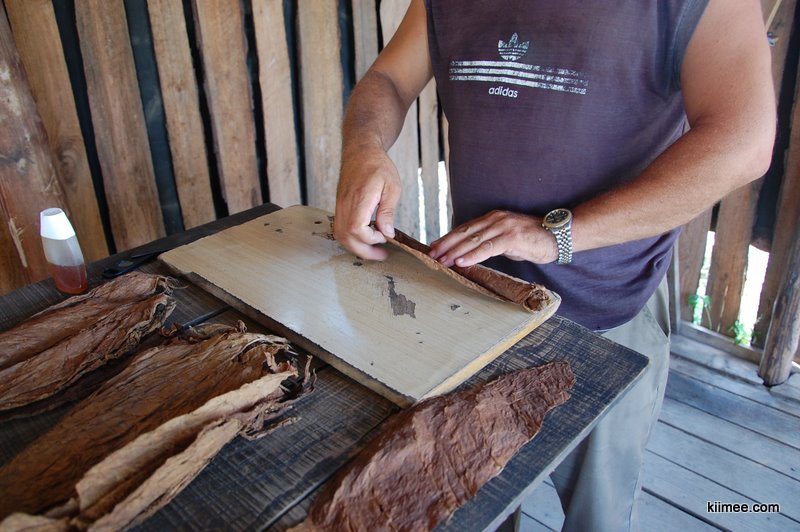 过了一会儿,农场主人给我们演示如何制作雪茄烟,用三种不同烟叶分别作为内、中、外三层,最后用蜜粘住封口。幸好我们之前看过中文的介绍,否则这西班牙语还不听得一个头两个大。雪茄卷好了,我们都试抽了一下,不过不会品这个,不知道好不好。kingwing也学着卷了一只,卷得非常紧,抽起来很辣。临走我们单买了一只雪茄,连同向导演示与kingwing自己动手做的两支一共三支,这个购买量显然让农场主有些失望,于是说莫西多酒也要收费的,一共5CUC。回来路上照例一路无语,导游在路边拔了几个像红薯一样的根茎,呱啦呱啦一通,大意是这个可以吃。虽然我们对于这场旅行有些失望,但这并不是向导的责任,而且向导看上去是个不错的人,路途辛苦,我们单独给了1CUC小费。