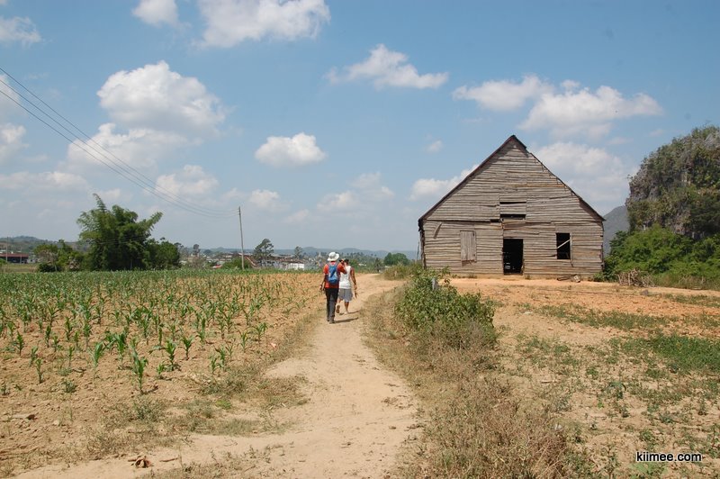 就这样一路跟,一路走,大约过了半个小时,我们已经拐出主路,走进田野。眼前是一个大谷仓,小伙子终于停下来表示要到了。我们先“参观”了下厕所,比较崩溃的是古巴人在厕所放了一个大木箱子,像马桶的样子。研究了一下,貌似只能爬到箱子上蹲着。这样委实太辛苦,上个厕所还得爬高,要不得自带马桶圈,不像咱国内直接俩木板架一个缸上就搞定了。
